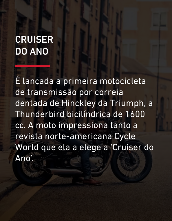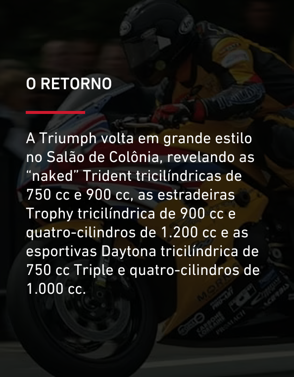 Na Triumph, acreditamos que pilotar vai além de chegar a um destino — é sobre viver intensamente cada curva, cada quilômetro, cada batida do coração. Desde 1902, criamos máquinas que unem engenharia de precisão, performance incomparável e design atemporal.